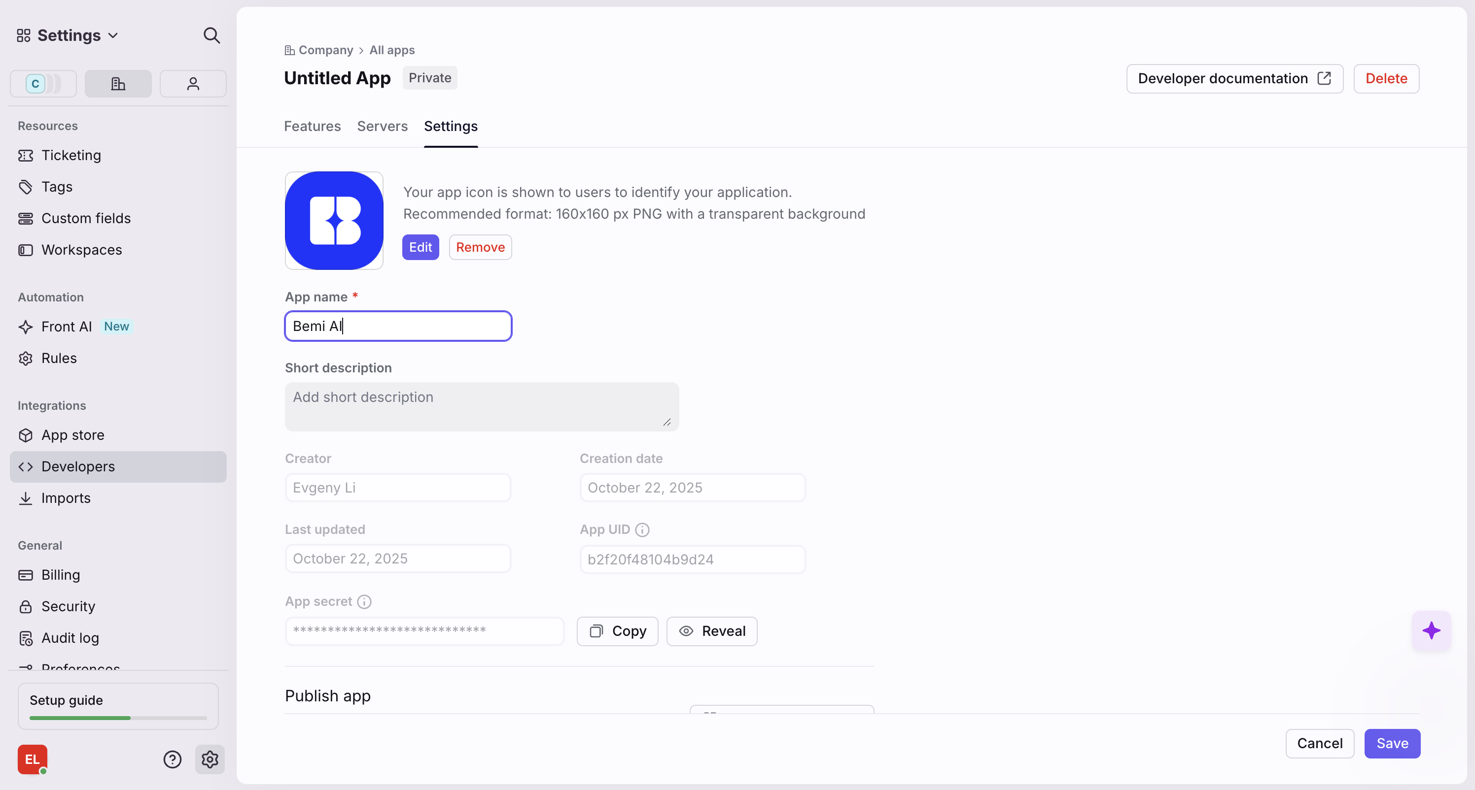 - Go to the app Settings, rename the app to Bemi AI and upload the Bemi AI logo: