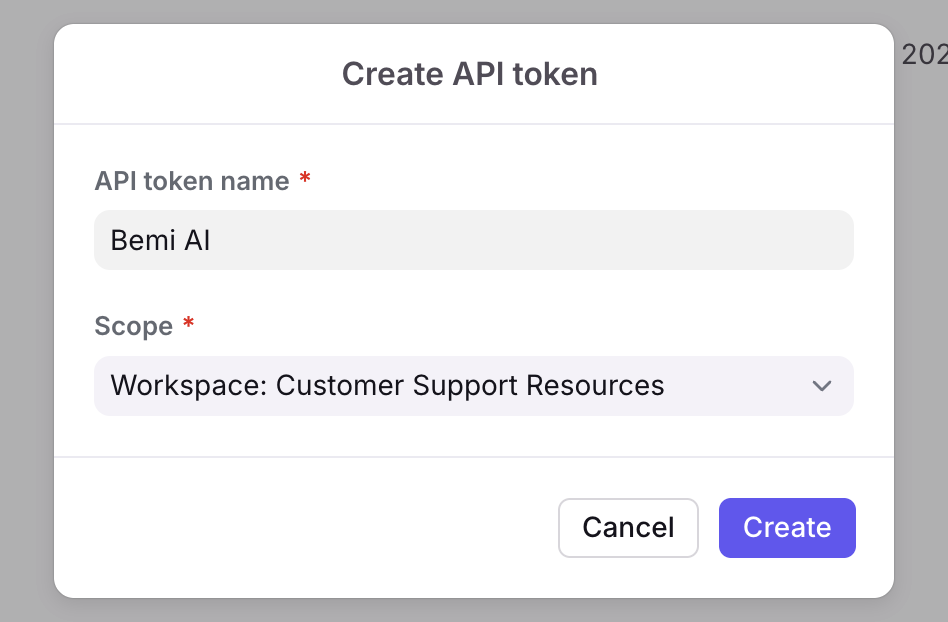 - Enter Bemi AI as the name for the token and select Workspace: [YOUR_WORKSPACE] Resources as the scope.