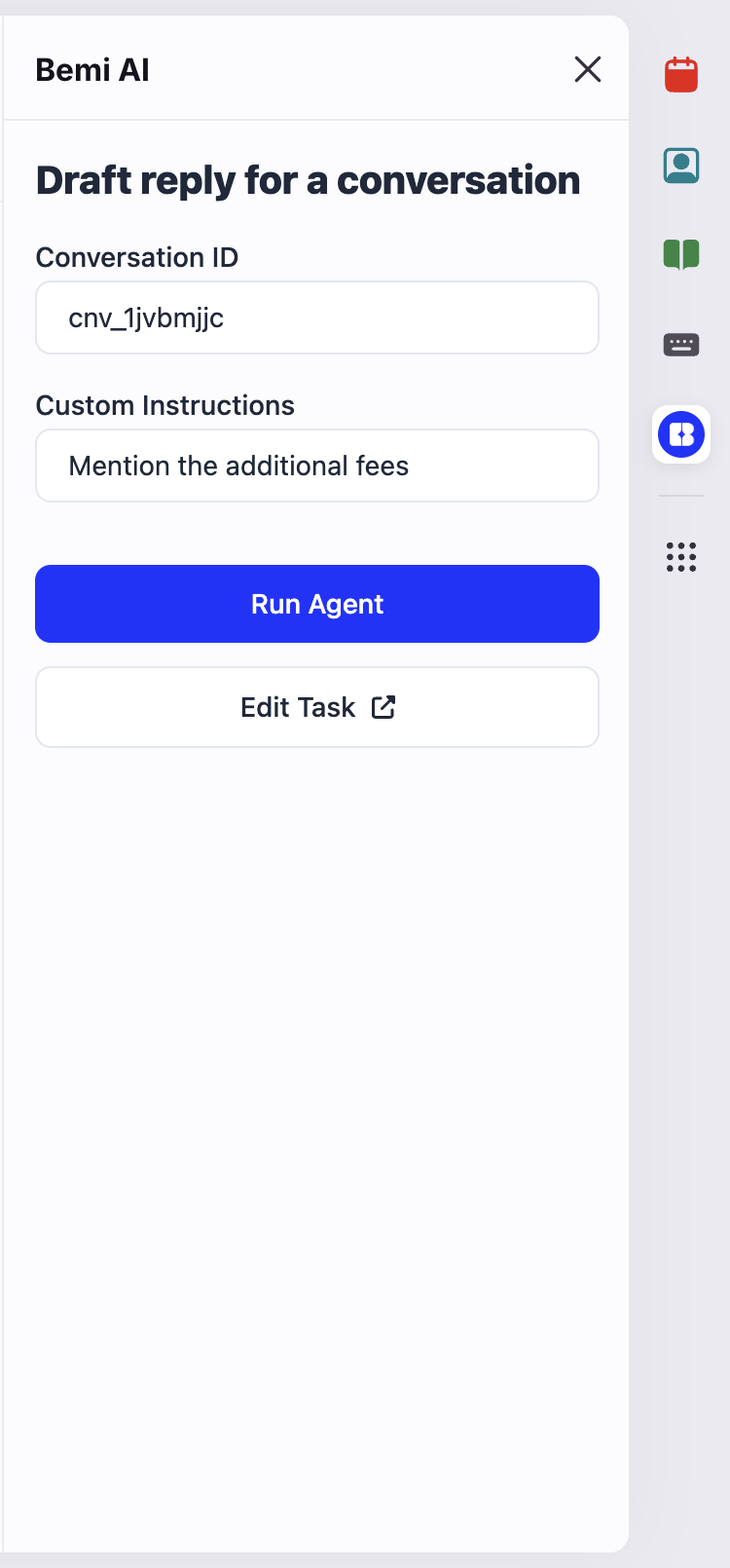 You can enable the Bemi AI sidebar in Front to interact with your AI agents directly within the Front interface.