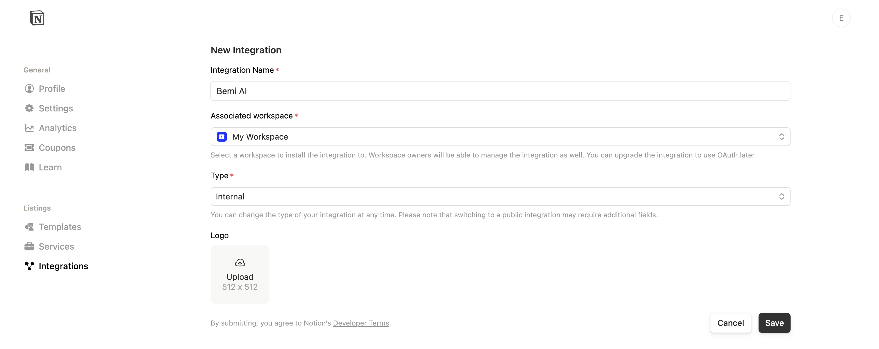 1. Enter Bemi AI as the integration name, choose your workspace, select Internal type, and upload the Bemi AI logo: