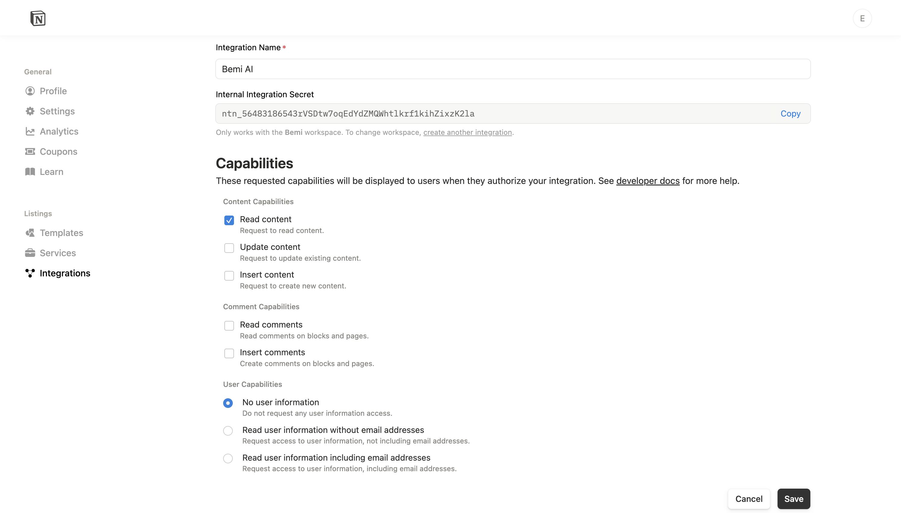 2. Copy the Internal Integration Secret to use in the next step.