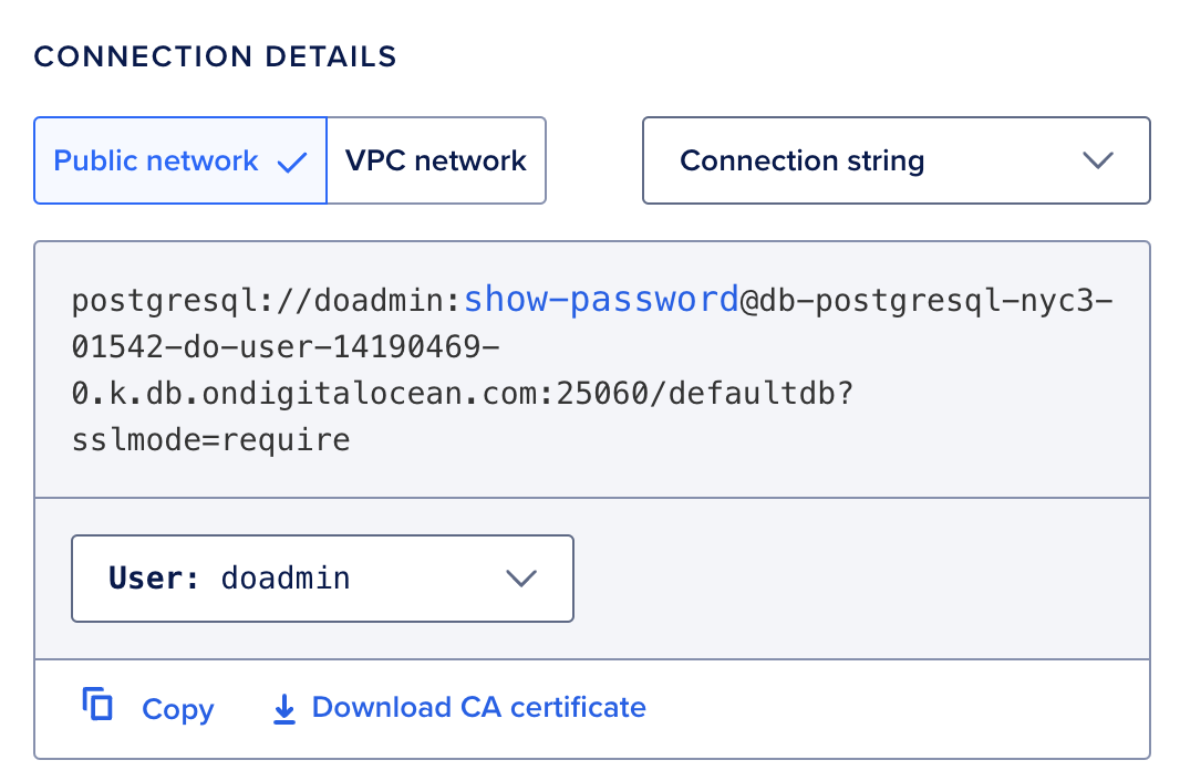 - In the Connection Details section, choose Connection string from the dropdown menu.